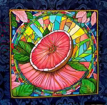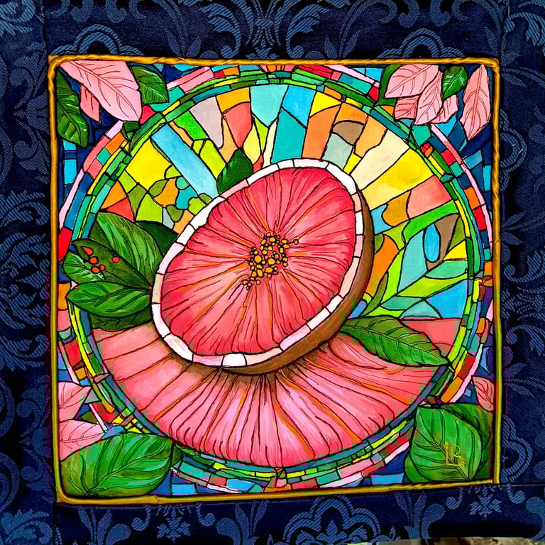Bright, juicy, and full of life — these stained-glass-inspired textile panels celebrate the abundance of nature. Each fruit glows from within through color and fabric, creating a vibrant tribute to the essence of life, its flavors, fragrances, and hues.