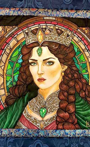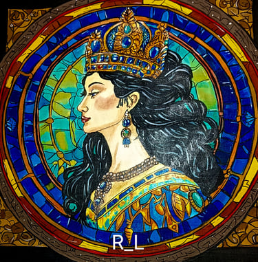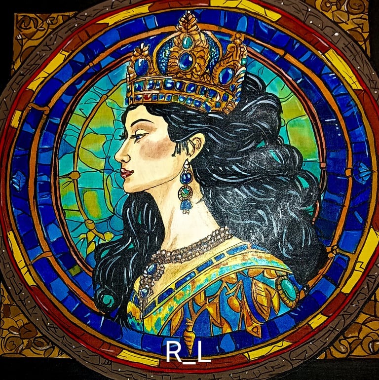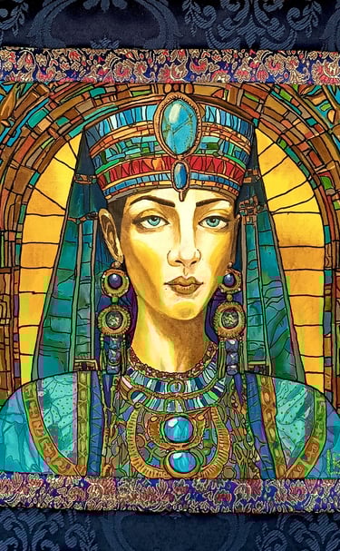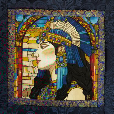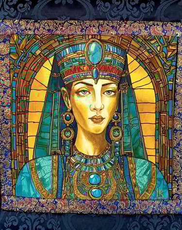 This cycle of five textile panels depicts five powerful female figures from different cultures and eras. Each was chosen for her historical impact, strength of character, and symbolic depth. Each work is made using a textile art technique, mimicking the style of Art Nouveau stained glass.