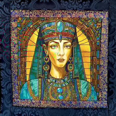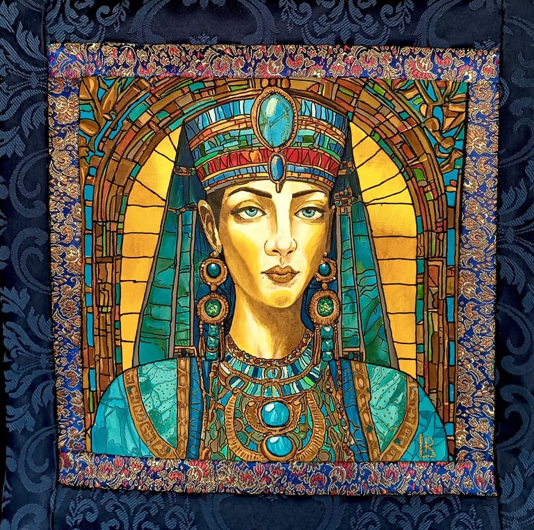 Cleopatra VII was the last ruler of the Ptolemaic dynasty. This portrait reflects her strength, grace, and diplomacy. The blue-golden tones, stone background, and ornaments emphasize her charisma and influence in the ancient world.