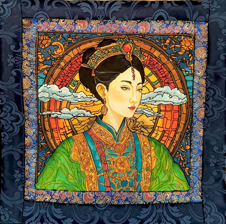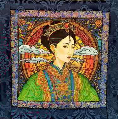 Wu Zetian (624–705) was the only woman in Chinese history to rule as an official empress. Her portrait embodies power, wisdom, and strategic insight. Traditional motifs, a solar disc, and deep gold-turquoise tones highlight her divine right to rule.