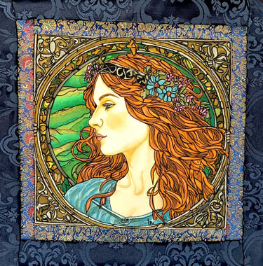 Queen Medb (Maeve) is a legendary ruler of Connacht from Celtic mythology. Her direct gaze and strong expression reveal her independence and warrior spirit. The emerald background and Celtic knots reference her Irish heritage.
